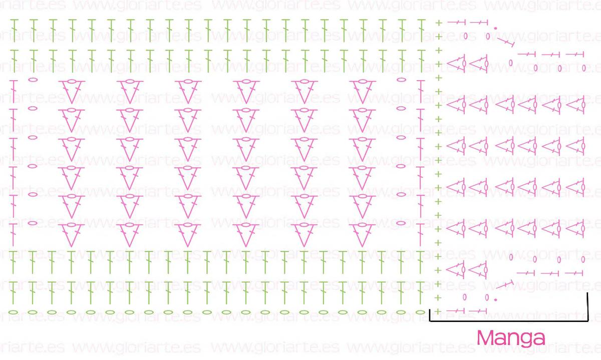 Realizar 3 puntos de cadeneta (equivalen a un punto alto o vareta), 1 punto de cadeneta, saltamos 2 puntos y en el siguiente hacemos un punto V (punto alto, cadeneta, punto alto), saltamos 2 puntos y en el tercero hacemos otro punto V. Continuar toda esta vuelta hasta llegar al último punto en el que realizaremos una cadeneta y un punto alto. Hacer de esta manera 19 vueltas, tal y como refleja en gráfico (publicado más abajo)