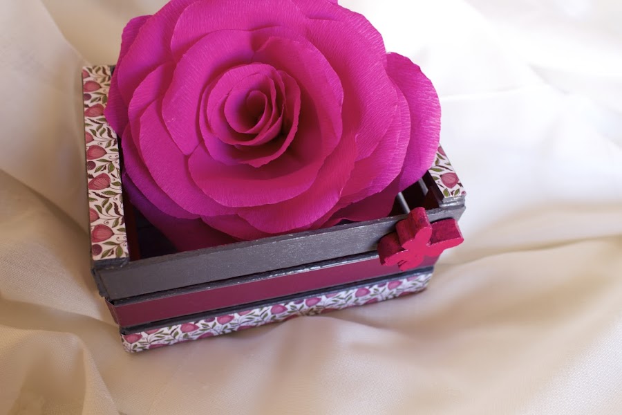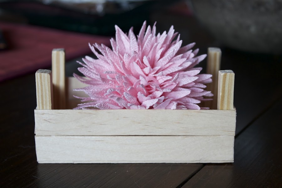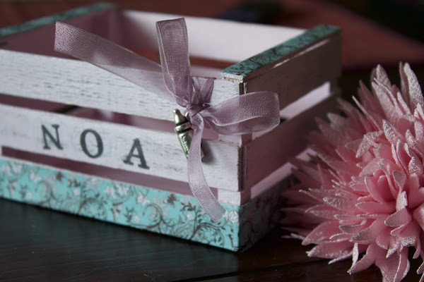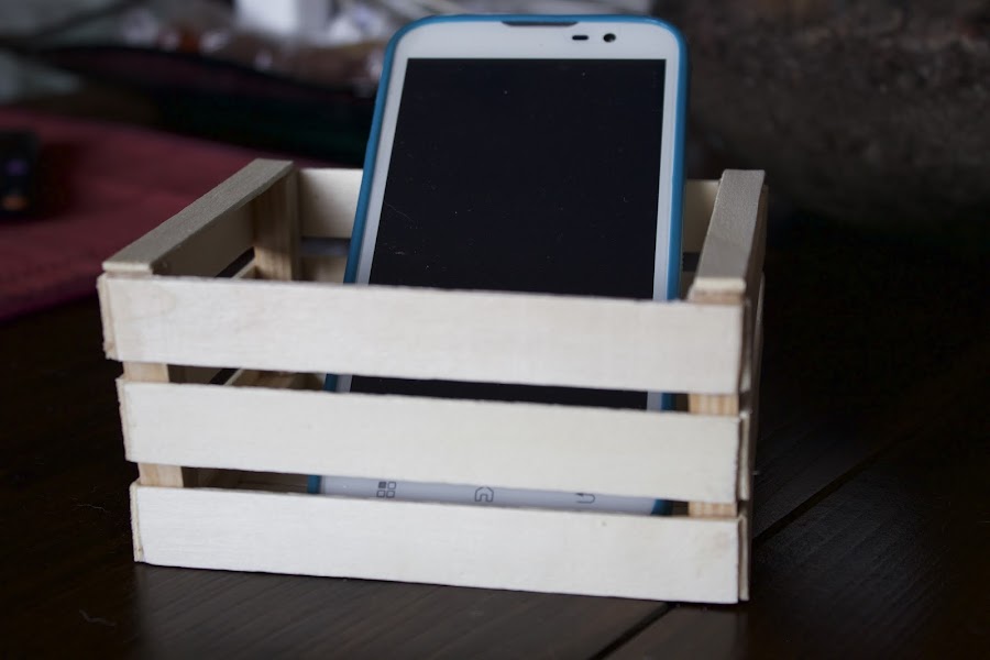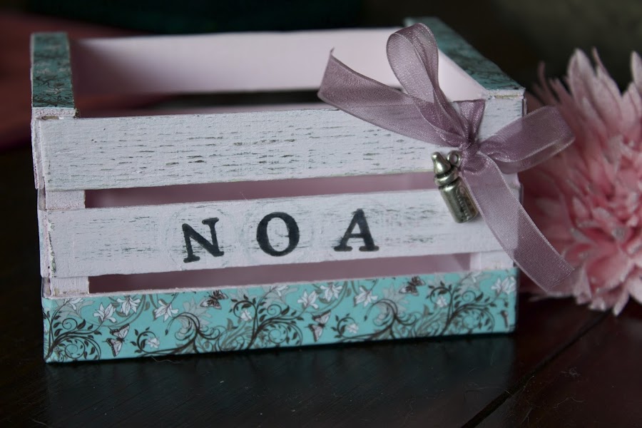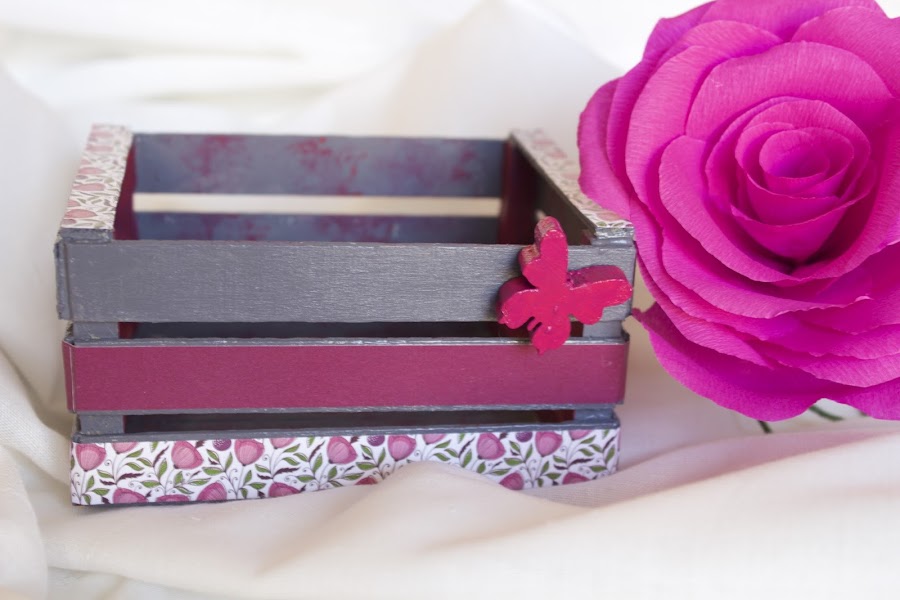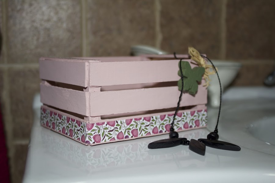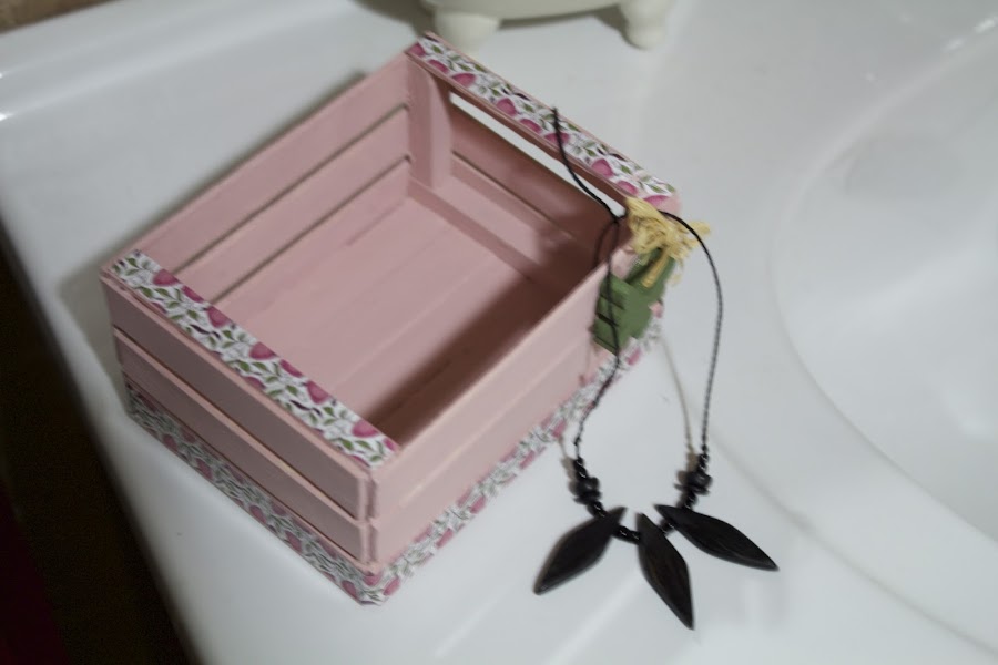 Primero la lije y luego le di una capa de pintura rosa palo por dentro, y por fuera un color marrón pero solo a los palos de arriba y central. Una vez seca la primera mano le di una segunda de rosa, esta vez a toda la caja, para una vez seca lijar los palos que había pintado de marrón.