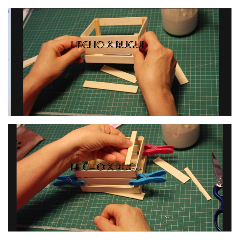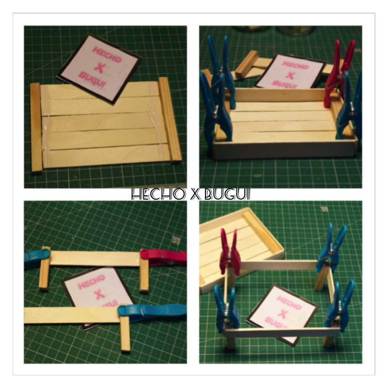 Por otro lado he unido un palo de 12 cm con dos de las 4 barillas, de la forma que se ve en la foto y después dos palos de 9 cm a las mismas barillas, así tenemos la parte de arriba y la parte de abajo de la caja.
