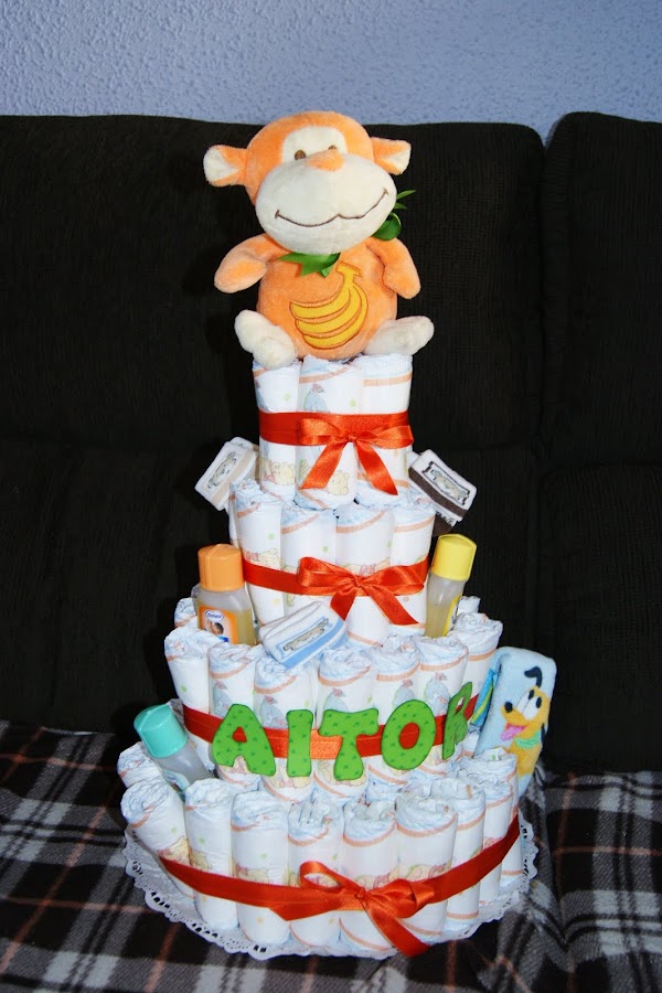 Y como no me pareció bastante,pues le hice algo muy útil cuando nace un bebe...una tarta de pañales!! lo que me divertí haciéndola! espero que os guste.