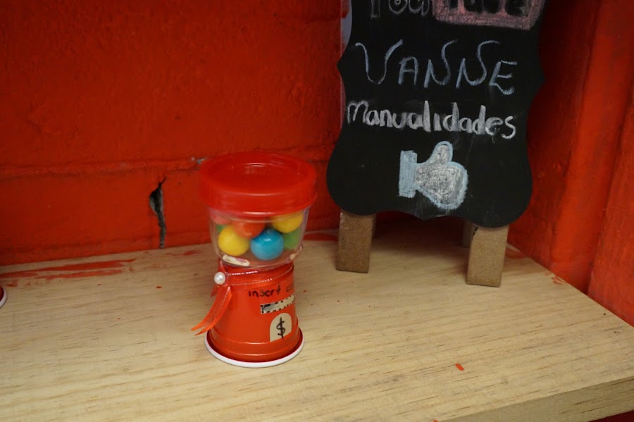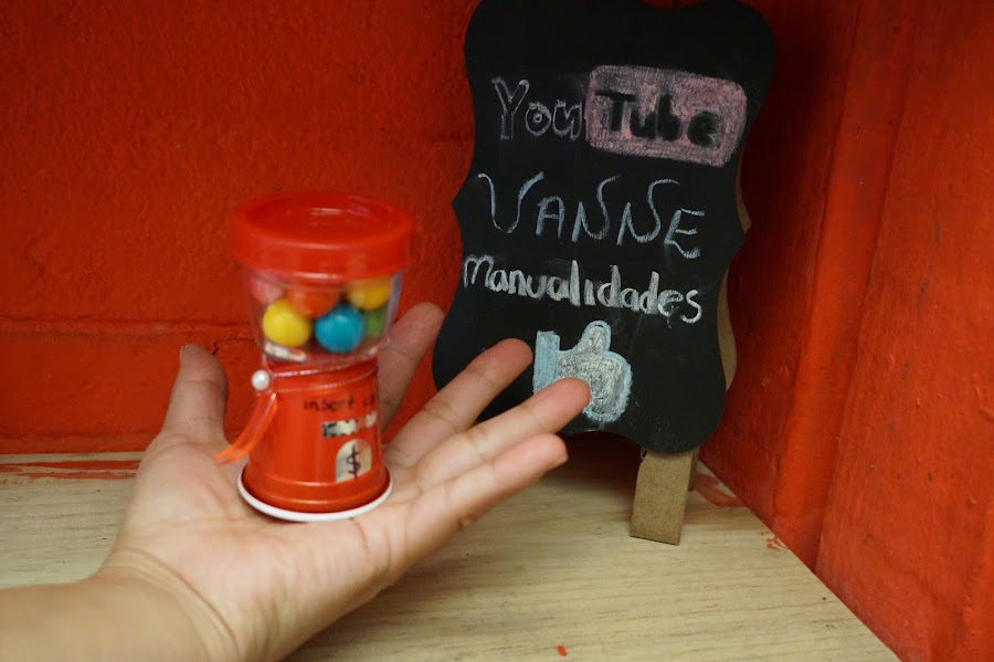 Lo primero que vamos a realizar es pintar la tapa del envase plástico, cuidando de no tocar la parte de abajo. Una ves seco colocamos los chicles. Ahora vamos a trabajar con el vasito rojo, en el pegaremos un rectángulo pequeño del papel lustre color plateado que simulará la entrada de la moneda. Otro que sera como un medio ovalo que simulará la salida de los chicles, pegalo con el silicón frío.