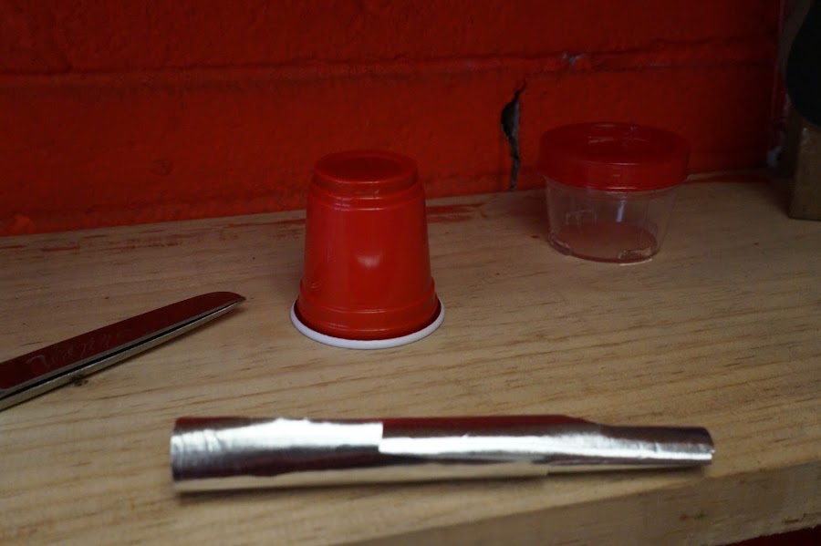 Ahora lo que queda es unir el envase de los chicles con el vasito rojo, lo haremos con silicón caliente para que pegue más rápido.