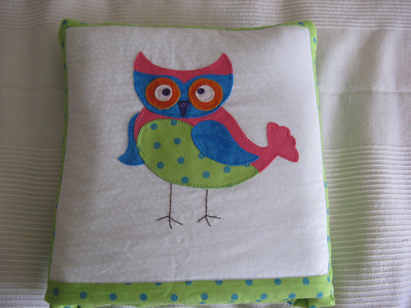 En el cojin le ha aplicado un buho con telas que combinan con los colores de la manta,