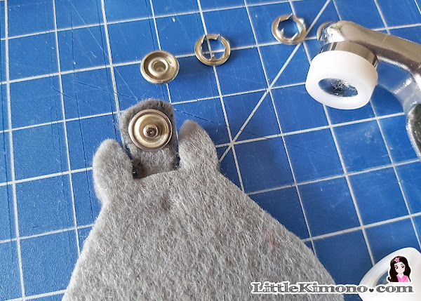 6. Ahora colocamos un broche de presión, primero en la parte frontal y luego apretamos sobre la pieza de atrás de fieltro para marcar donde irá la otra pieza y así nos quede centrado en su sitio.