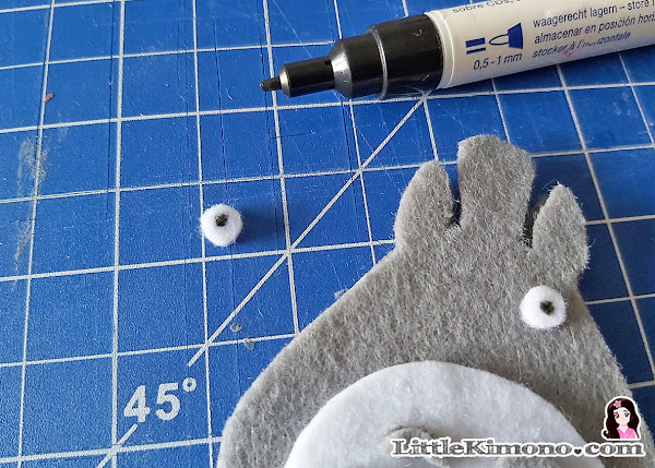 5. Ahora los ojos en los que pintamos un punto con rotulador permanente y con el mismo dibujamos boca, bigotes y nariz, aunque esta última yo la corte en fieltro negro.