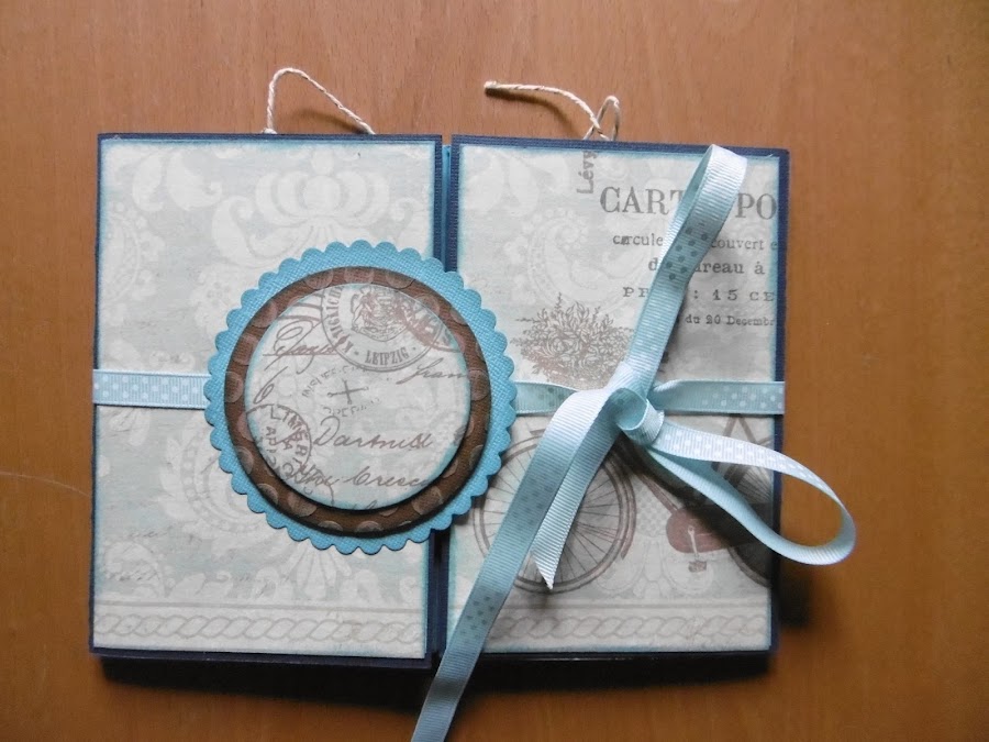 En la portada he hecho una pequeña variación, solo una cinta y no he centrado el circulo para que se viera el motivo del papel decorado, no le puesto ningún adorno, lo que he probado no me gustaba por lo que lo deje asi, que el papel hable por si mismo....