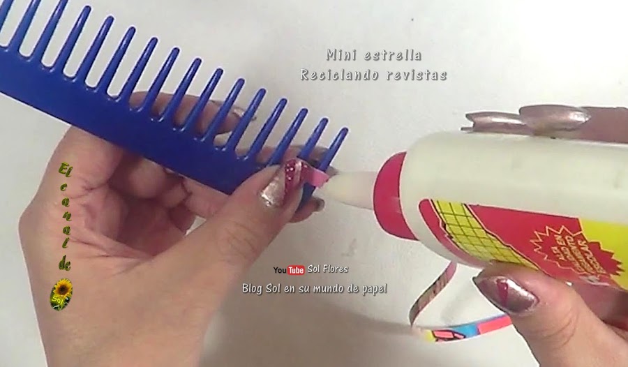 Tiras de hojas de revista cortadas a lo largo de 1 cm. de ancho, cola blanca, alfileres, un peine de dientes anchos, un trozo de cartón o de unicel, broches para ropa y glitter.