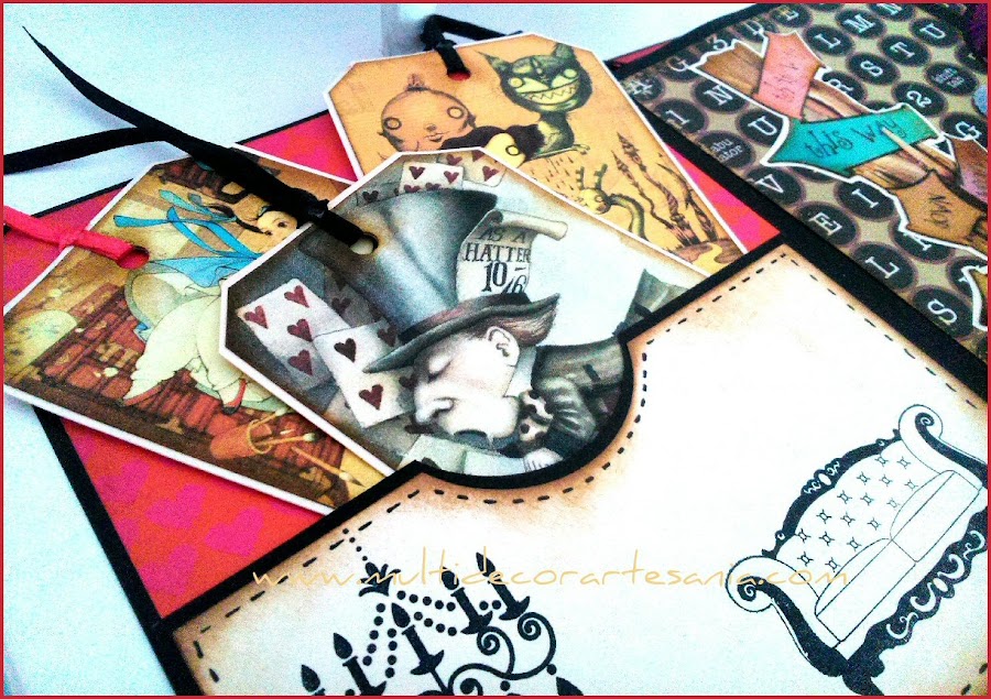 Para el interior un papel en tonos rojos con corazones y otro liso en crema para el bolsillo que contiene los tres tags con imágenes del cuento.