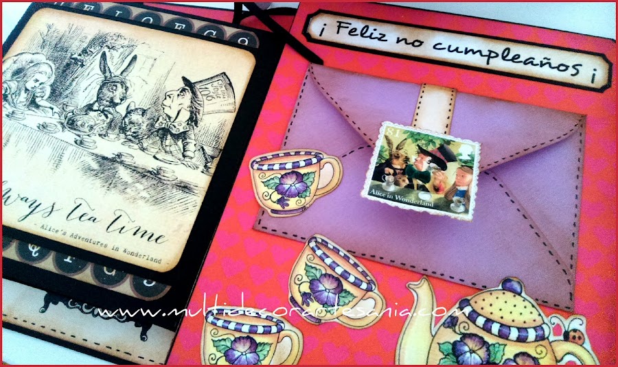 Los tonos lilas también están presentes en la última parte del Flip book, tanto en el sobre que guarda la carta como en las flores del juego de té, imágenes que he impreso y recortado.