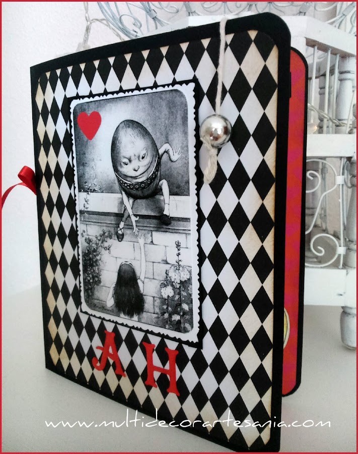 Para el exterior he optado por un papel de rombos en blanco y negro, la portada, con una imagen resaltada también en estos colores se completa con pequeñas decoraciones en tono rojo como la cinta del lomo, el corazón o las iniciales de la destinataria A H.