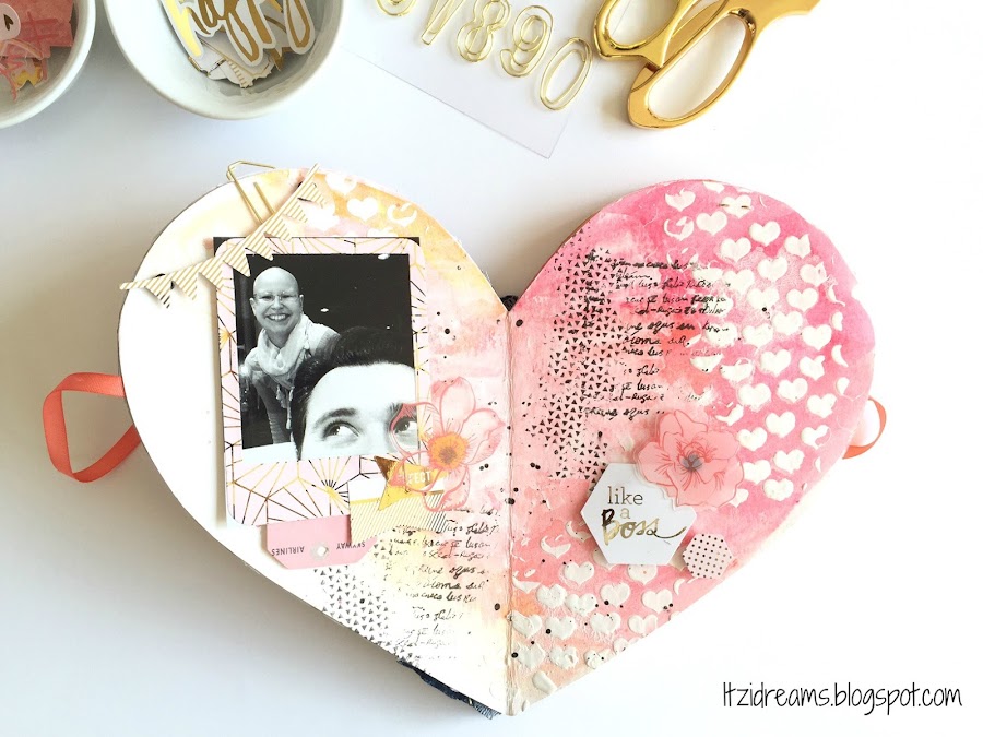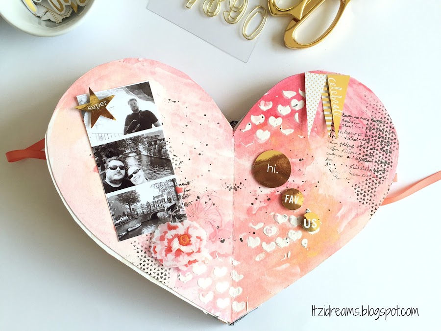 Hoy os quiero enseñar el mini que he preparado para el día de los enamorados, en forma de medio corazón y técnicas Mix Media. Para darle forma de corazón a las hojas, primero hice una plantilla, dibujando un corazón mediano en un trozo de cartón y traspasando el dibujo a papel de acuarela. Una vez recortados los corazones, empecé con los fondos de las páginas. Para ello utilicé las acuarelas Prima Marketing.