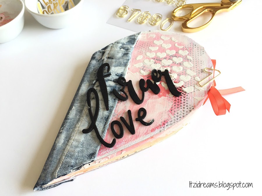 Por último, pero no menos importante la portada, como el mini tiene tantos detalles no quise recargarla mucho. Hice un fondo como en el interior, forre el lomo con ropa tejana y puse el titulo con las palabras “ Forever Love” en Foam de la colección Documentary, de Dear Lizzy.