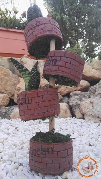 He utilizado una latas sujetas en un palito que he fijado a la lata inferior con yeso para que tenga peso. Con unos agujeros en las latas y sujetas con silicona cada lata parece "flotar". La parte inferior de cada lata también la he revestido de musgo para completar el aspecto vegetal.