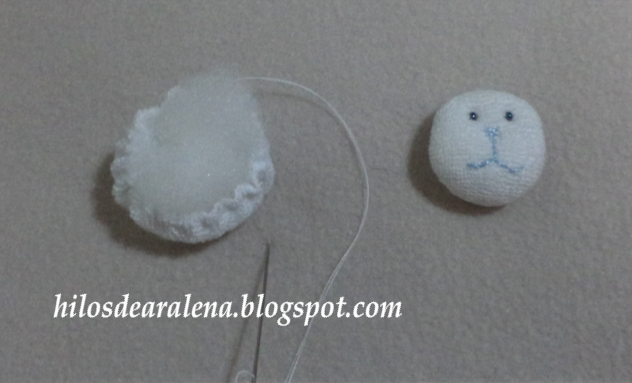 Cortamos 2 circulos un poco mas grandes. Los cosemos enfrentando los derechos , damos vuelta y rellenamos . Partiendo del centro con puntadas bien largas marcamos la que será la melena.
