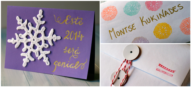 La tarjeta de felicitación navideña llevaba un copo de nieve a ganchillo, que en un próximo post os explicaré como hacerlo, y lo pegué a la cartulina que rezaba el mensaje "Este 2014 será genial"... quería huir del típico mensaje de "Feliz Navidad" y intenté hacer mis pinitos con la tipografía hecha a mano... desde hace tiempo se me ha antojado hacer algún curso de lettering, buen propósito para este año nuevo!