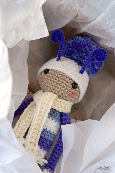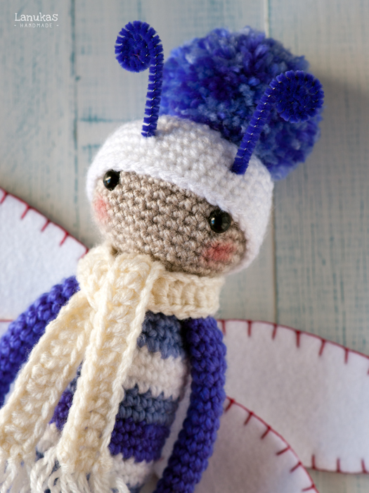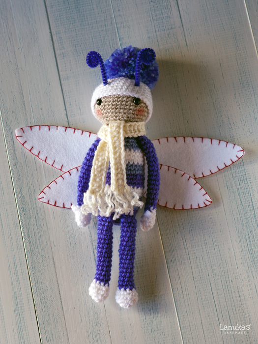 Así que le hice su amigurumi inspirándome en el patrón de este Winter Doll by Annaboo"s House. Nada más verlo me encantó ese ponpon en la cabeza, le añadí unas antenas a conjunto con un par de limpiapipas y unas alas de libélula con fieltro que rematé los bordes para que no quedase tan soso.