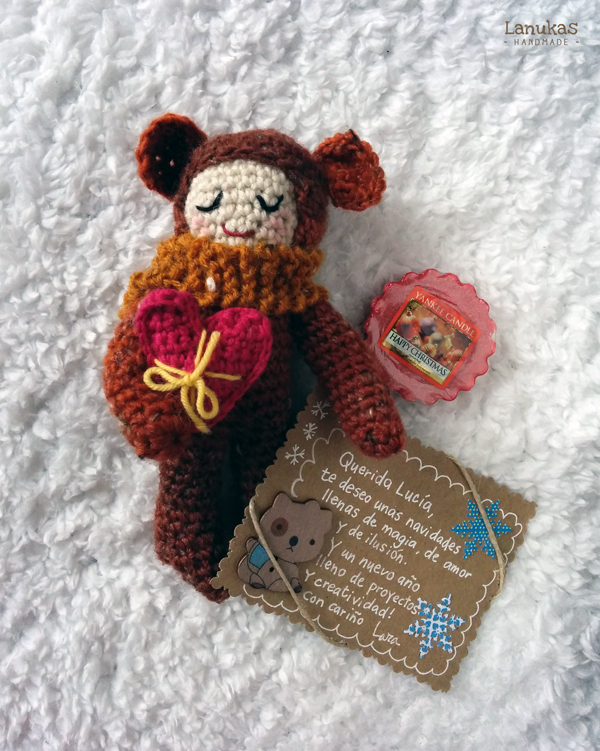 Y a los pocos días, yo me convertí en la sorprendida. Esta vez de la mano de Lariella Monella! Me envió este duendecillo junto con su tarjeta y una vela Yankee Candle... que no veas como huele! Lo tengo haciendo compañía al resto de amigurumis que decoran una estantería del comedor.