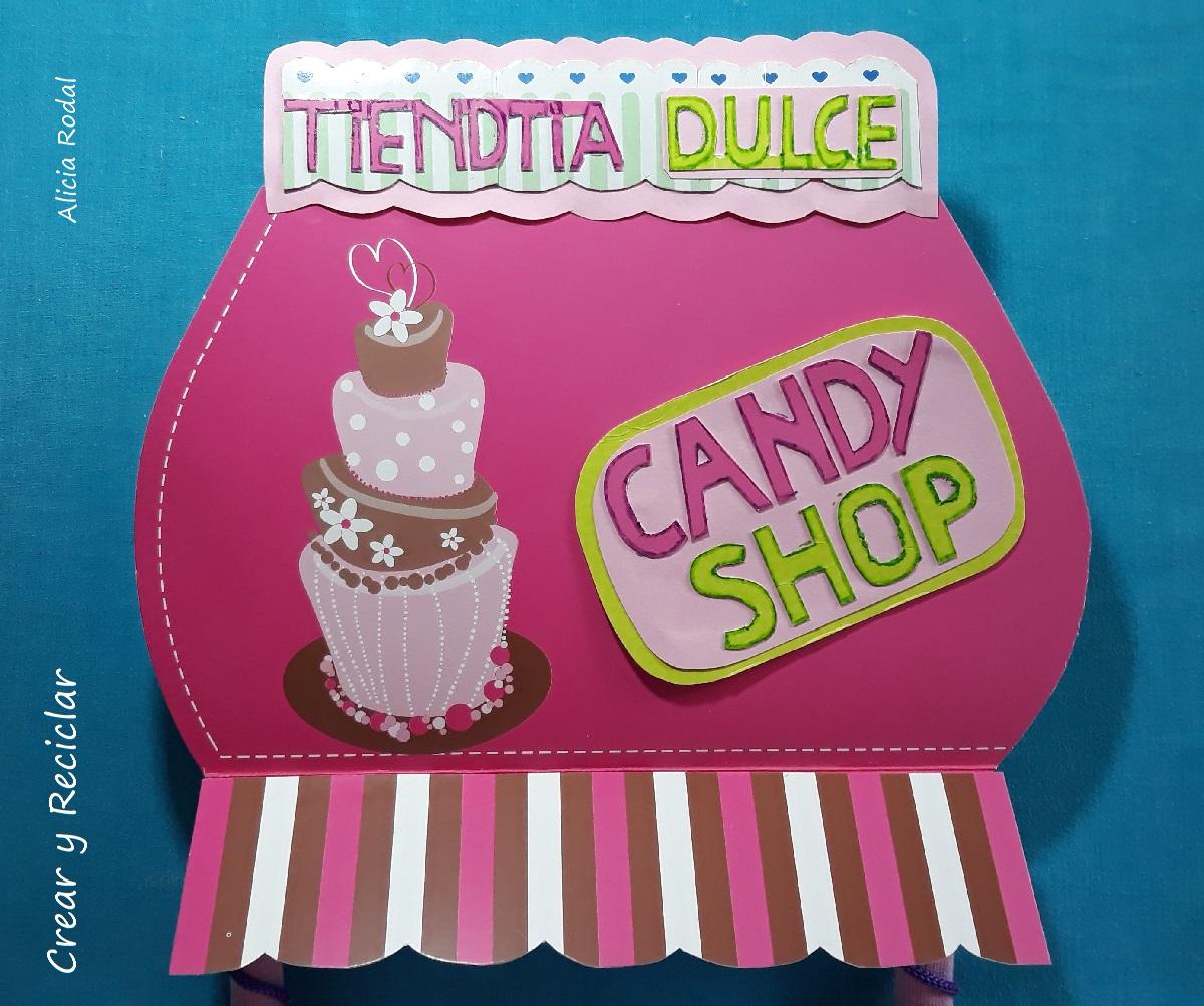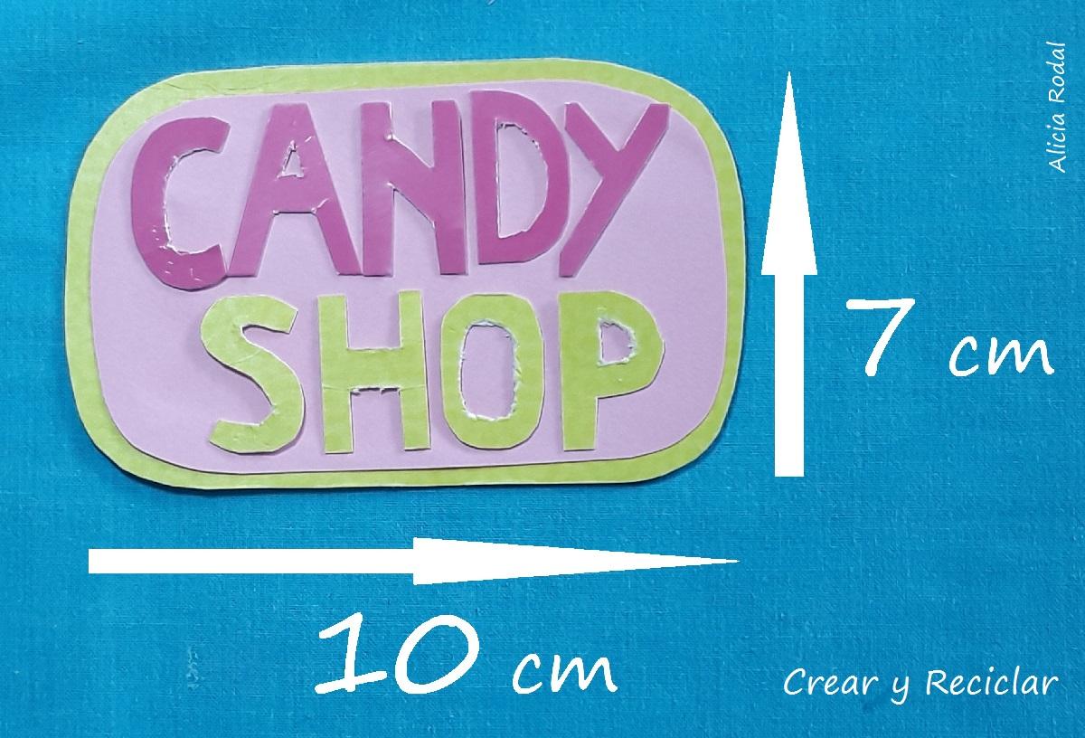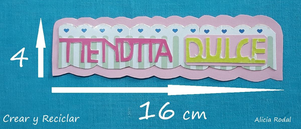 El letrero TIENDITA DULCE lo pegué en la parte superior de nuestro letrero y el otro, CANDY SHOP lo pegué al lado de la imagen de la tarta, con un poco de inclinación. Así nuestro letrero ya está terminado: