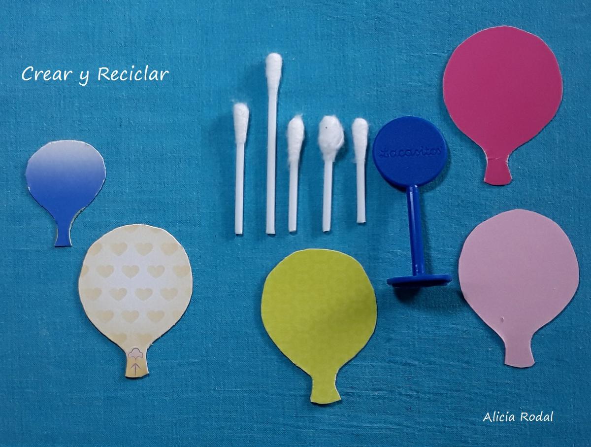 El palito de plástico de la chupeta la recortaré en la parte de abajo para luego poder pegarla en la mesa. Los palitos de oídos los recortaré para que queden de diferentes tamaños y los cartones los recortaré con la forma de un globo, de 4 cm de diámetro aproximadamente.