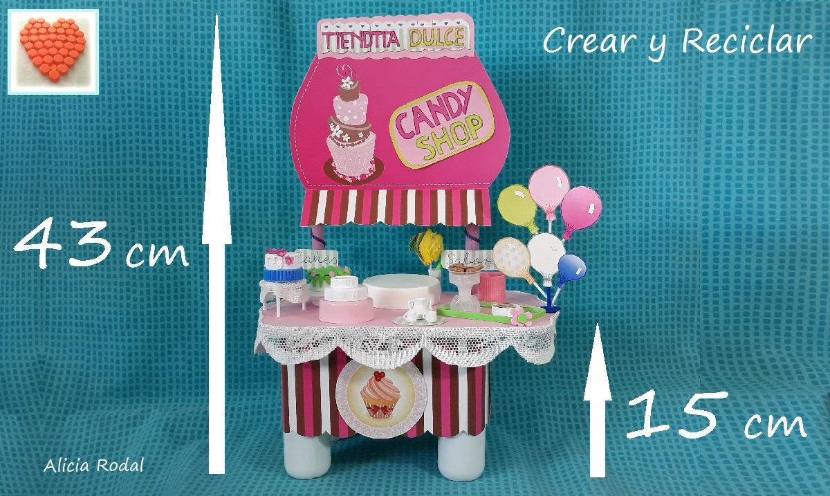 Nuestra tiendita de dulces mide en total 43 centímetros de altura, por 15 cm de ancho y 17 de profundidad.
