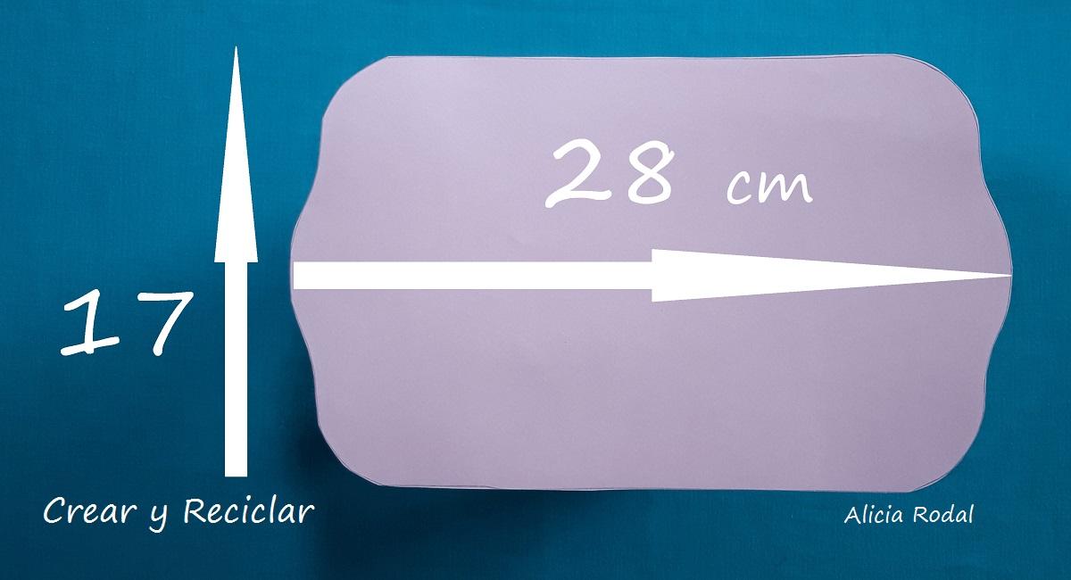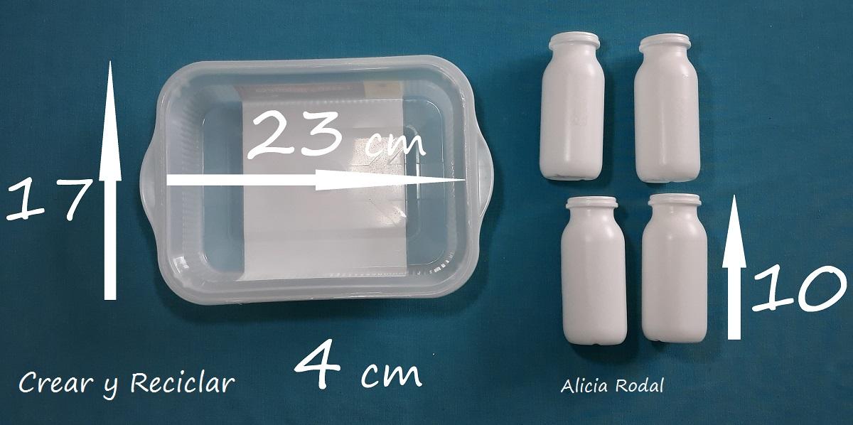 El envase de plástico que yo reutilicé es un rectángulo que mide: 23 cm de ancho, por 17 de largo, por 4 centímetros de profundidad.