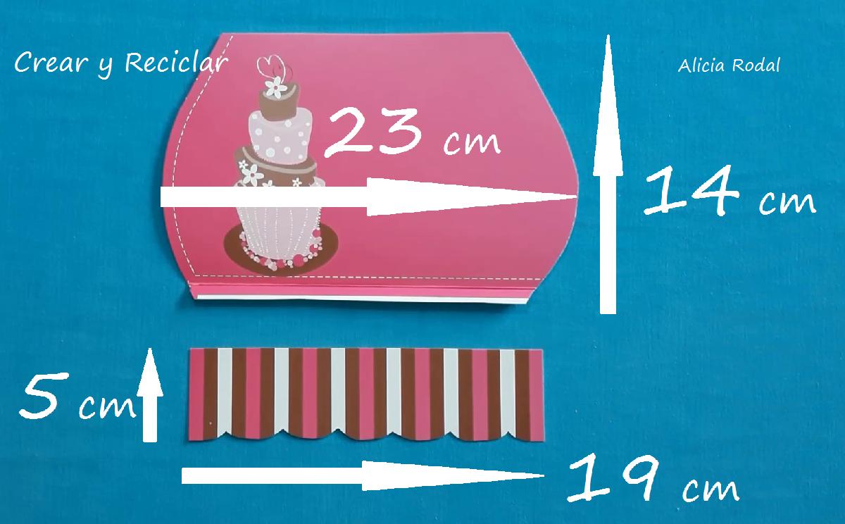El diseño del letrero será un poco según el propio diseño de la caja, para la parte de arriba escogeré la zona donde está el dibujo de la tarta, recortando el cartón con una forma media redonda en los laterales, con las siguientes medidas: