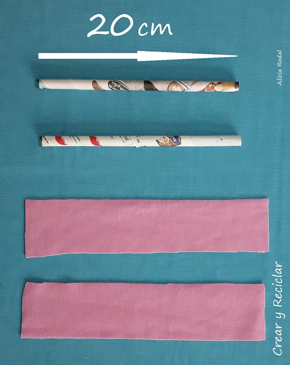 Cada tubo de papel lo recortamos por los extremos de manera que nos queda la parte central del tubo, que es la más gruesa. En total tenemos 2 tubos de 20 cm cada uno. Recortamos 2 tiras de un retal de tela, yo escogí el mismo tono rosado que he reutilizado en tutoriales anteriores. Si tu prefieres puedes reutilizar otro tipo de materiales o forrarlo con papel decorativo o pintarlos.