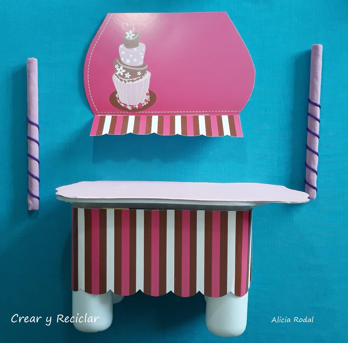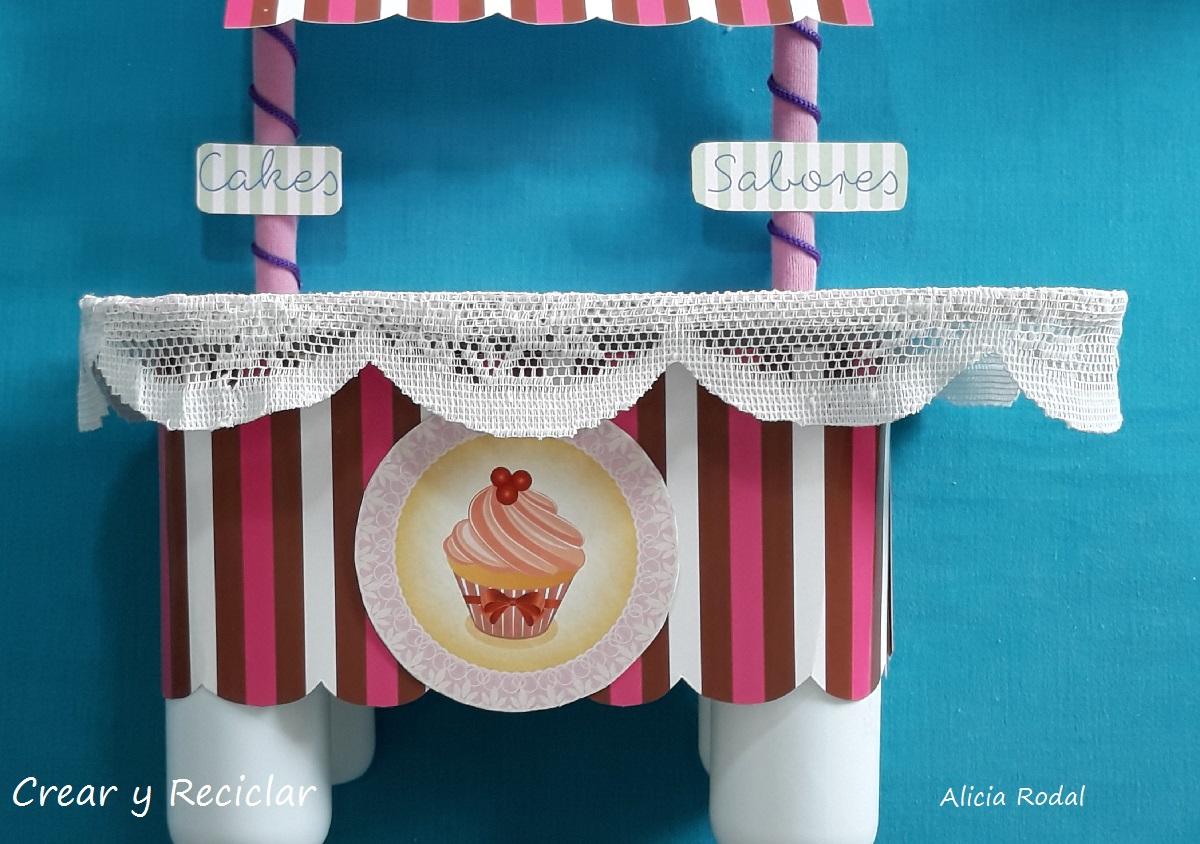 De otra caja de cartón de tartas (que ya he reutilizado en otros tutoriales) recortaré la imagen de un cupcakes y la pegaré en el centro de la parte frontal de la mesa. Recortaré también unos letreros con las palabras Cakes y Sabores y las pegaré en las columnas.