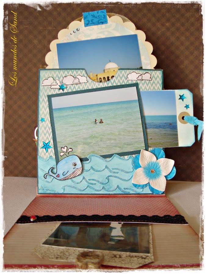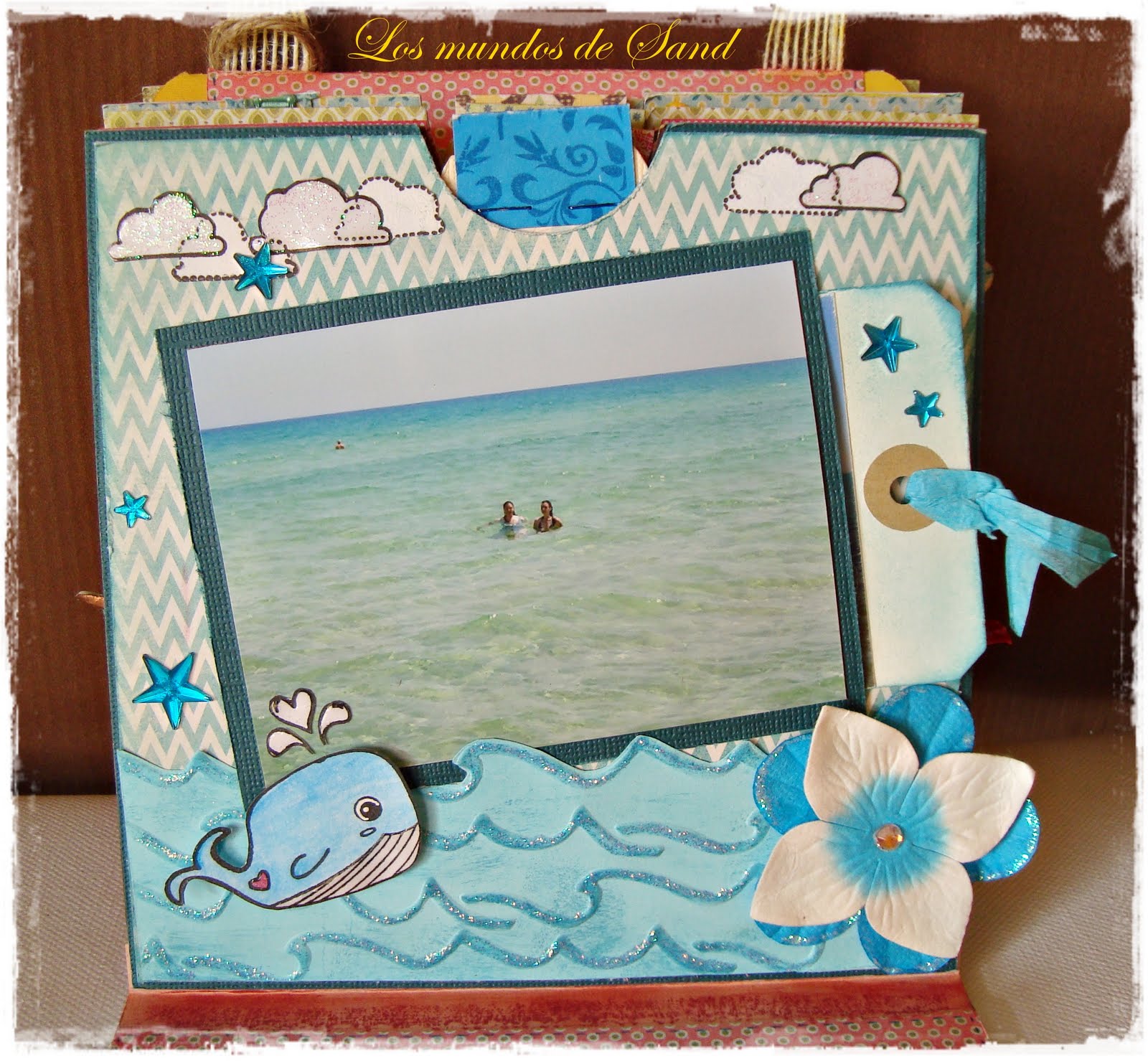 Si abrimos el bolso lo primero que vemos es un refrescante chapuzón en el mar. Dentro contiene una galleta y un tag con más fotos. Destacan los tonos azulados de los papeles, el sellito de la ballena y las nubes, y la pagina embosada con los stickles ensalzando las olas.