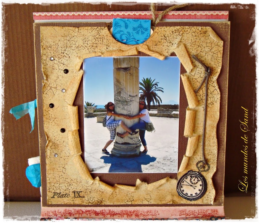 La segunda página está rasgada alrededor de la foto, envejecida con tinta Distress y un sello de textura craquelada. El resto brillantes y el sello del reloj con Glossy Crackle.