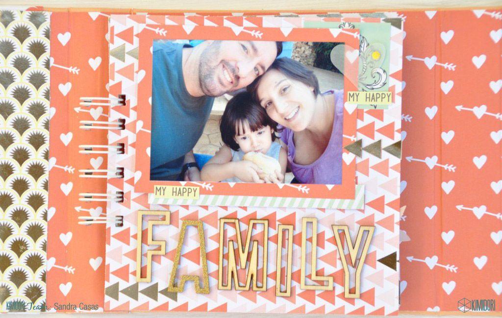En el interior del álbum las fotografías: comenzamos con la principal, decorada con pegatinas de la colección y adornos en madera, en este caso uno de ellos embossado con polvos "oro".