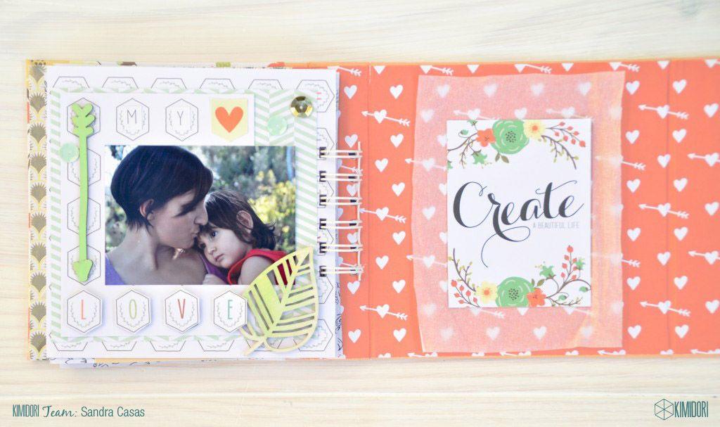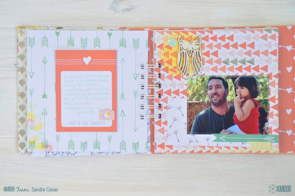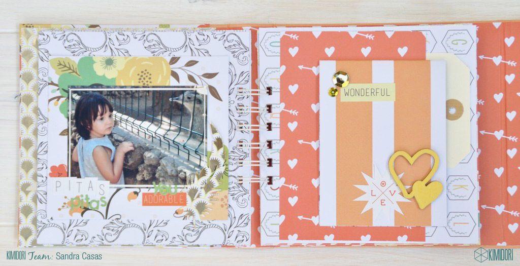 Los papeles son de Teresa Collins "Nine & Co" !divinos! y ha sido genial dejar aparcados los colores "rosa-azul-amarillo" y trabajar con otra paleta de colores que queda chulísima "naranja-menta-amarillo-dorado". La portada del álbum se compone de una etiqueta, un adorno de madera en el que he embossado con bolígrafo de embossing y polvos perla, preciosas lentejuelas de Teresa Collins y salpicaduras de tinta.