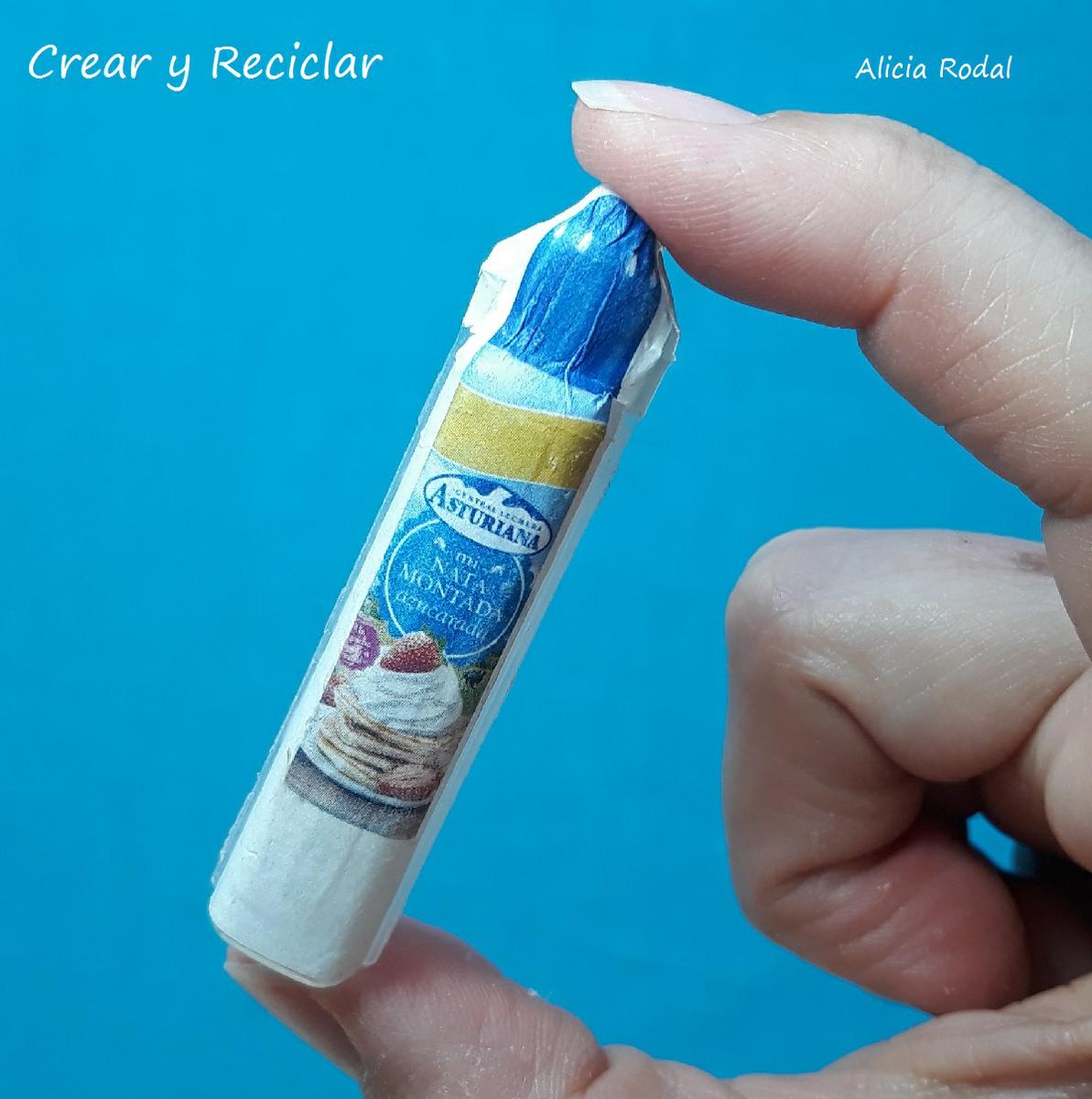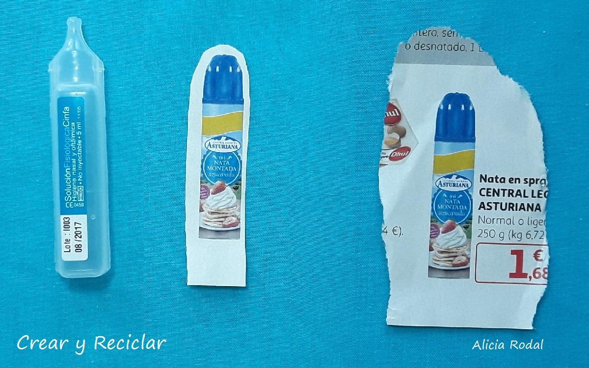 Recortamos una imagen del producto elegido, en una revista de las ofertas de los supermercados, en este caso reutilizaré 2 imágenes iguales de un envase de nata montada o crema chantilly, que pegaremos en el envase de plástico, una por delante y otra por detrás.