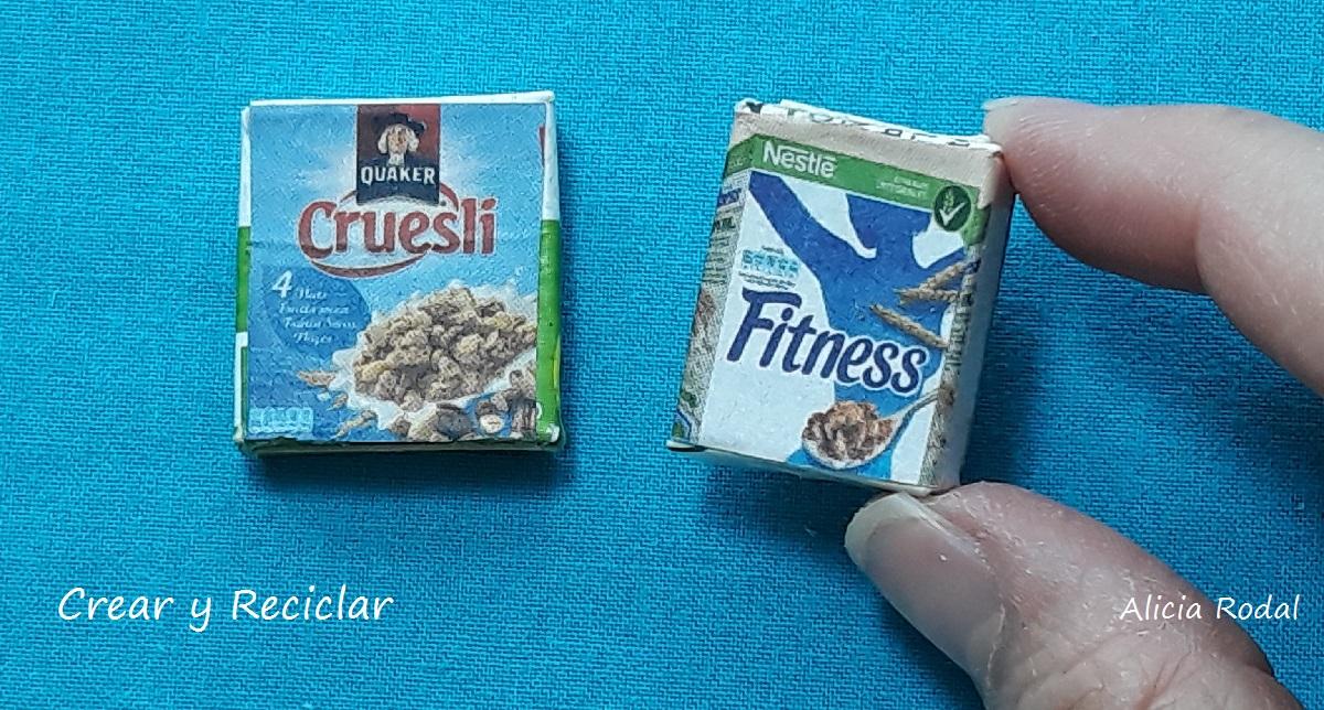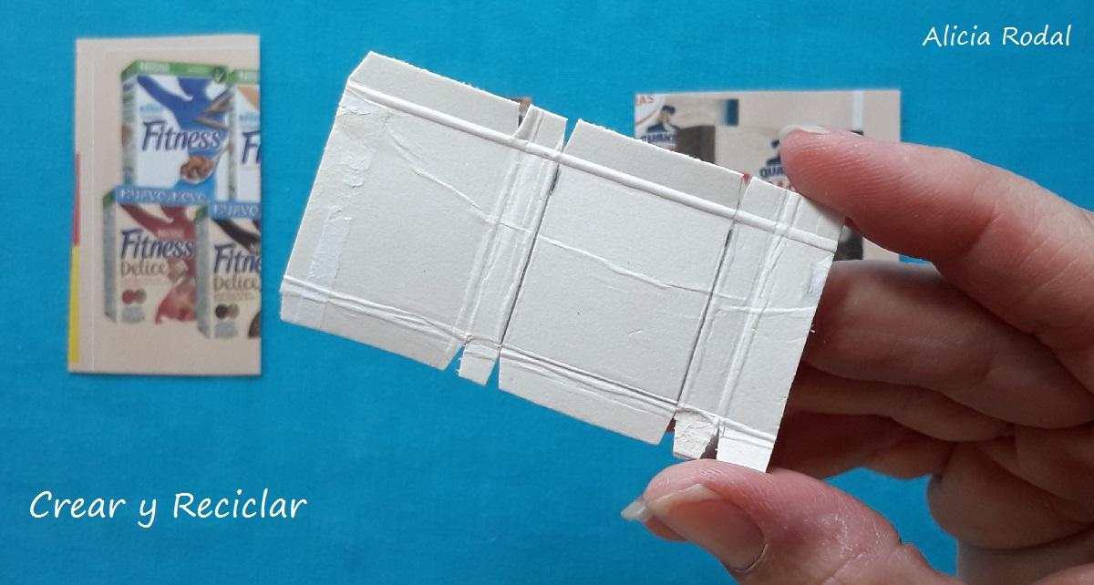 Esta idea es igual a la anterior, pero en vez de usar cajas de cereales, vamos a reutilizar las imágenes pequeñas de cereales de una revista de las ofertas de los supermercados. De esta forma nos quedarán unas cajas mucho más pequeñas, así que yo me imaginé que eran unas barritas o snacks (aperitivos) de cereales.