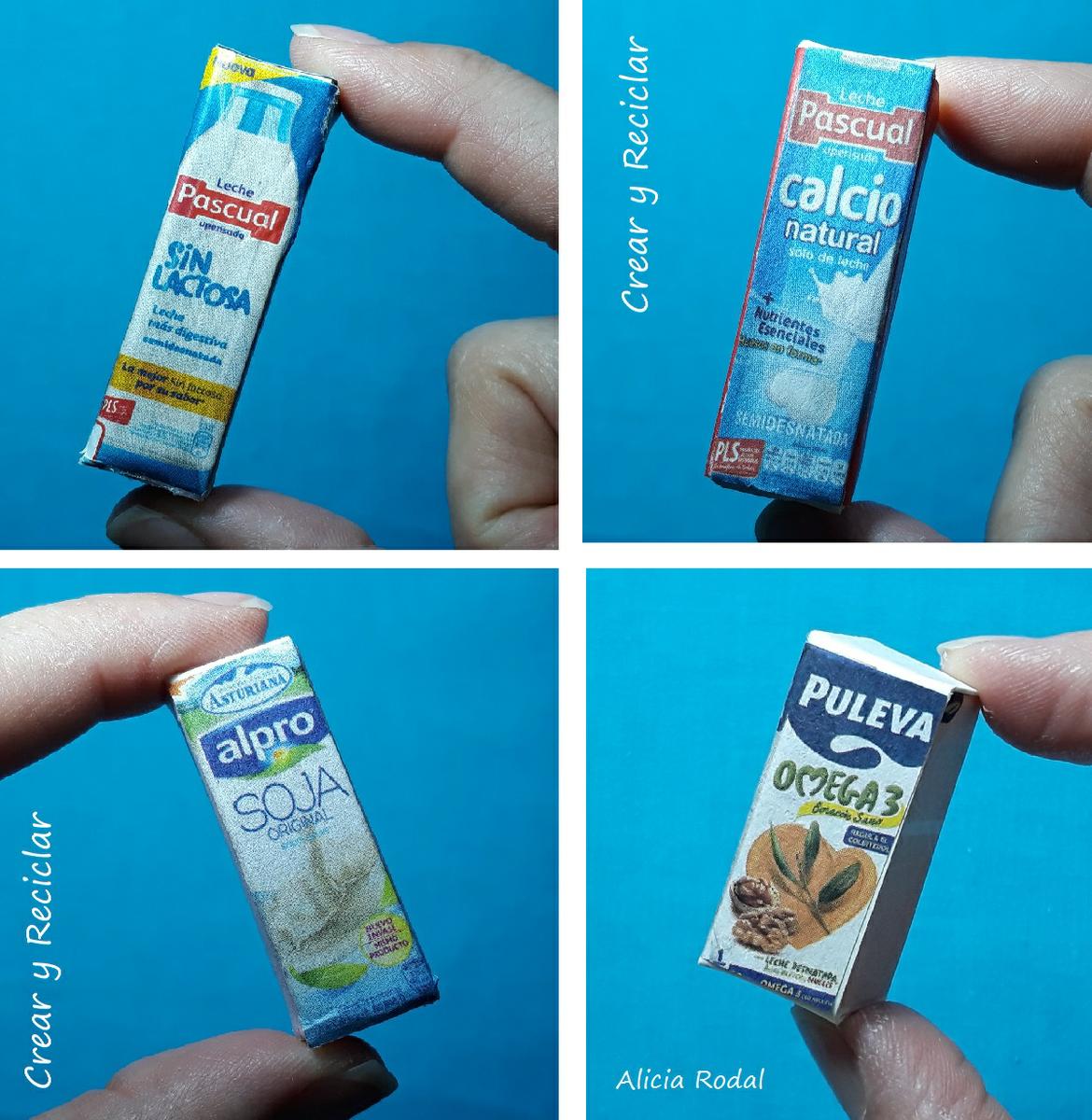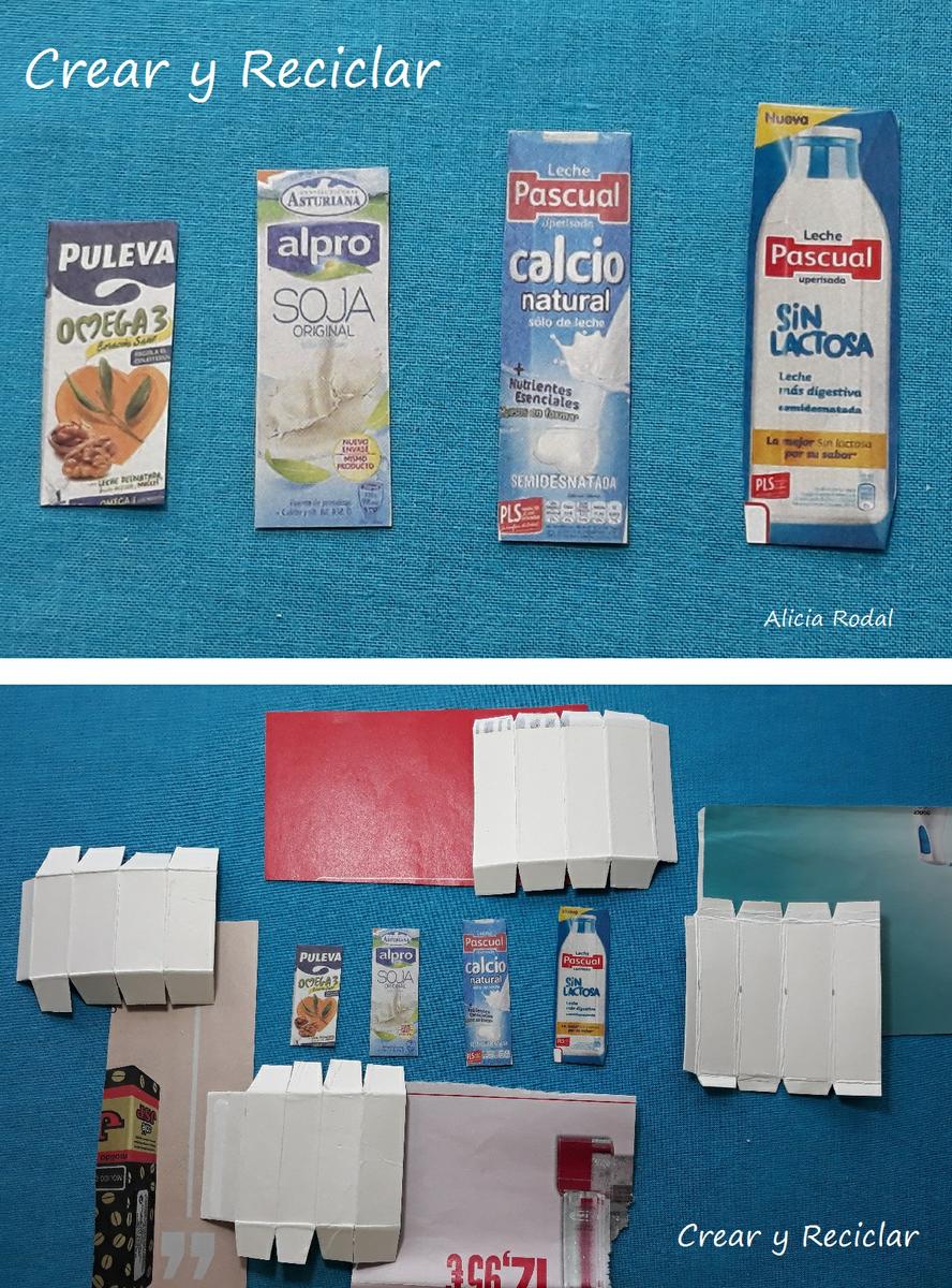 Hoy en día existen muchos tipos de leche, leche entera, desnatada, de soja, sin lactosa, de avellana, de coco, y un largo etc. Eso sin contar las leches infantiles, así que puedes escoger la que más te guste. Yo me decidí por 4 tipos de leche diferentes y de 4 marcas distintas. También es importante destacar que existen diferentes tipos de envases de leche, pero para esta idea voy a hacer los envases tipo tetrabrik.