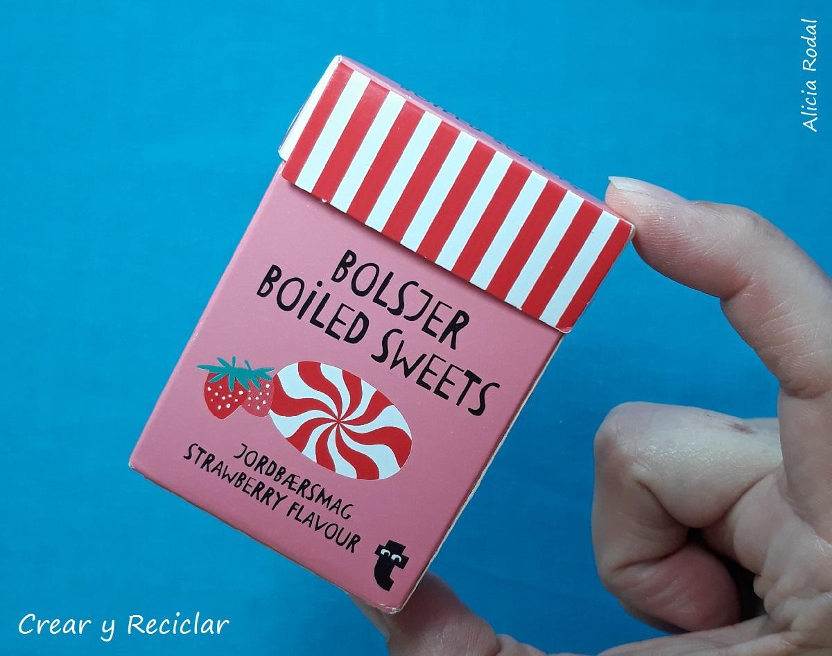 La última idea es muy similar a la de las cajas de cereales, con la diferencia, que en vez de usar una caja de cereales pequeña, reutilicé una caja de caramelos de fresa.