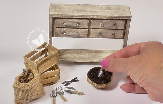 Lo primero que os enseño es el mueble, imprescindible en todo invernadero para poder guardar herramientas y transplantar las plantas, he utilizado una caja de frutas y pinturas acrílicas, y para los tiradores alambre de 1`2 mm y lentejuelas.