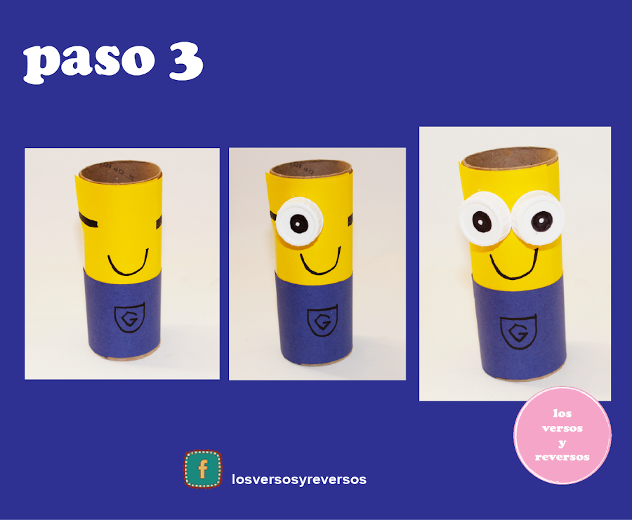 Para el PRIMER PASO, tienes que cortar el papel al tamaño del rollo de papel. Para el Minion, tienes que dejar el color amarillo más ancho que el papel azul.