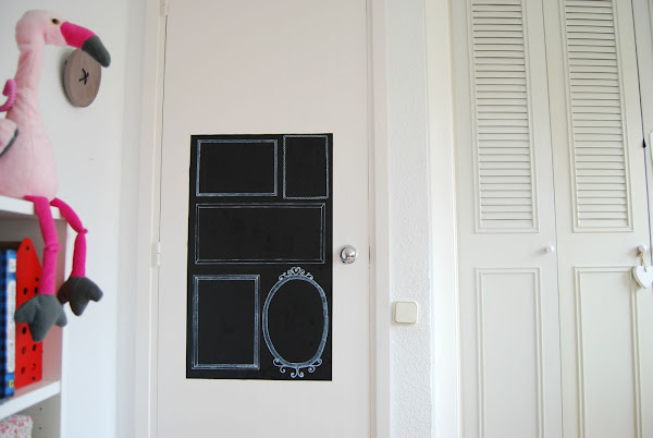 La habitación de mis hijas no es muy grande, pero ha demostrado que con un poco de ingenio, al final cabe casi todo. En este caso aprovechamos la parte de atrás de la puerta y para que tuviese un poco de gracia (y para que no se peleen por el espacio, que entonces se acabaros esas horas de tranquilidad...) dibujé unos cuantos "marcos", así las futuras obras de arte, quedan apropiadamente exhibidas :-)