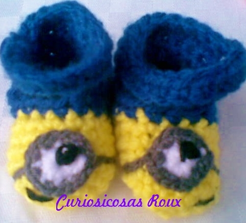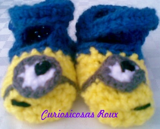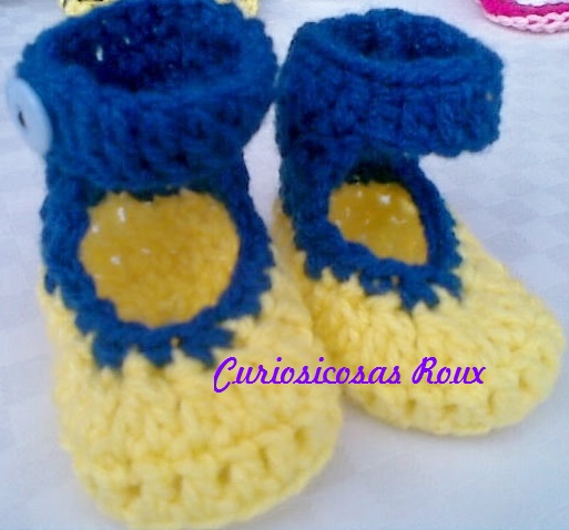 Pues inspirados en estos personajes les presento ahora estos zapatitos para bebe tejidos a ganchillo y realizados en suave estambre color amarillo con azul.