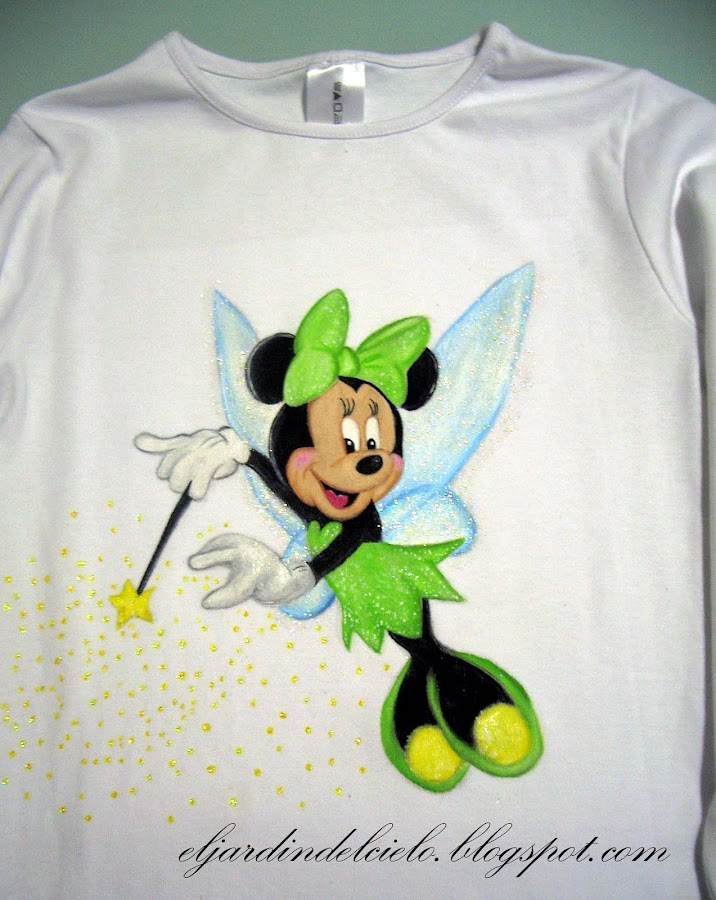 Ayer fué el cumpleaños de María. A ella y a su hermana Rocío les gusta mucho Minnie, Mickey y todo lo de disney. El año pasado en su cumpleaños le pinté a Minnie vestida de campanilla y su hermana Rocío se quedó como loca por tener una. Este año les he hecho una a cada una y así se le quita la espinita.