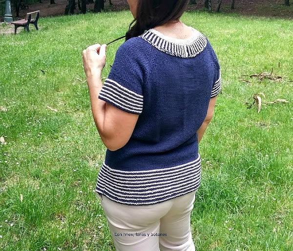 Se trata de una camiseta de verano sencilla y fácil de tejer. Se teje en redondo con agujas circulares empezando por abajo y el escote se teje unido al cuerpo con vueltas cortas. Me encantan este tipo de proyectos porque prácticamente no hay costuras y ya sabéis la pereza que me da eso de tener que coser las piezas al terminar de tejer.