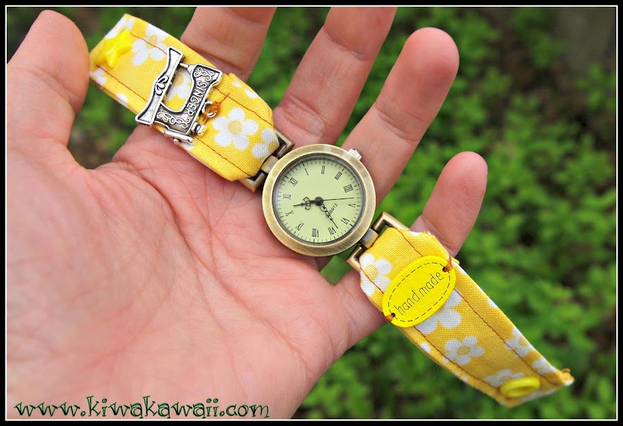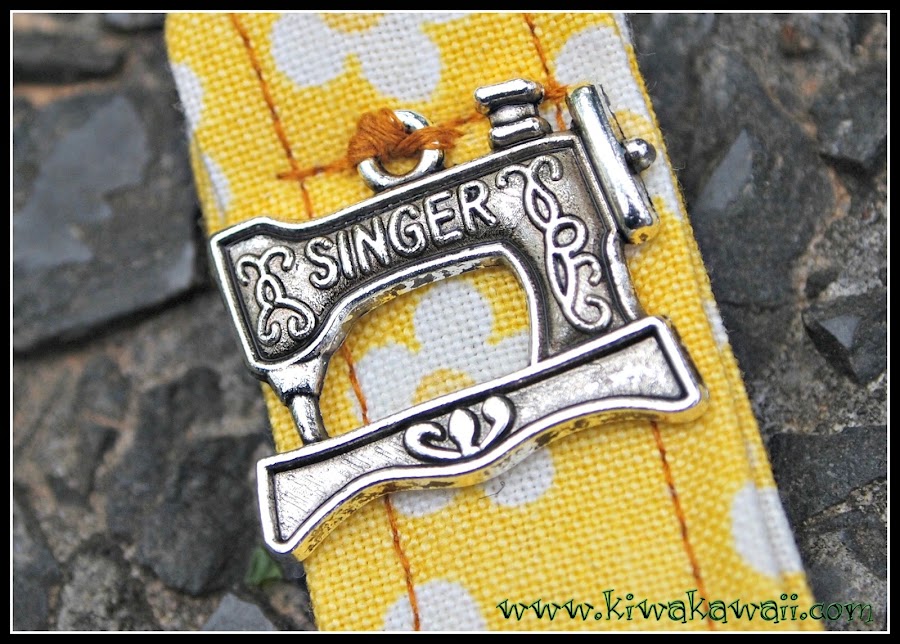 Amarillo con florecitas, con un colgante máquina de coser y una pieza de madera "handmade", cierre snap de estrella de Snapeando.