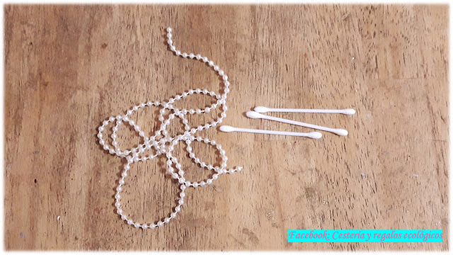 Complementemos la decoración con algunos cotonetes como centros o pistilos de las flores, y algunas falsas gemas o perlas de algún collar o pulsera que tengas a mano y que no uses...