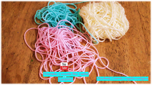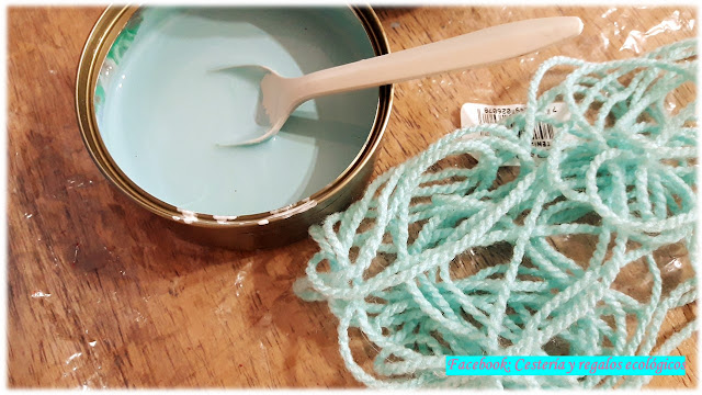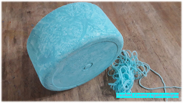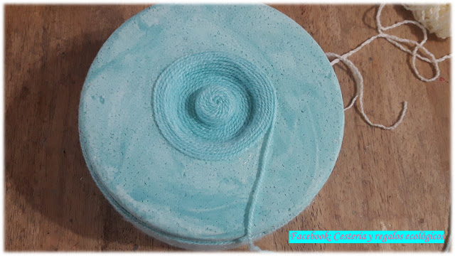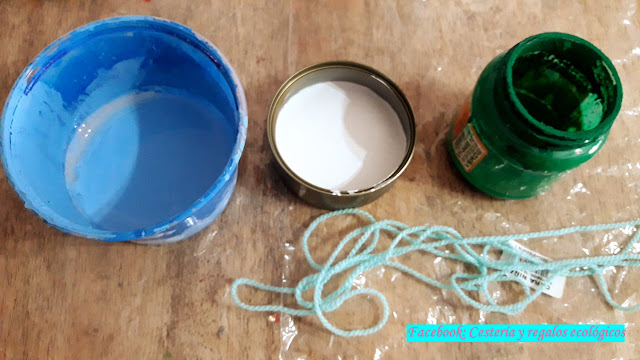 Antes de forrar el recipiente con los estambres, lo pinté. Como no pude encontrar color similar al del estambre azul-verde claro que había elegido, combiné un poco de pinturas acrílicas blanca, azul y verde para conseguir el tono adecuado... Aunque bien puedes omitir la pintura si haces el forrado bien tupido para que no se vea el color original del recipiente...
