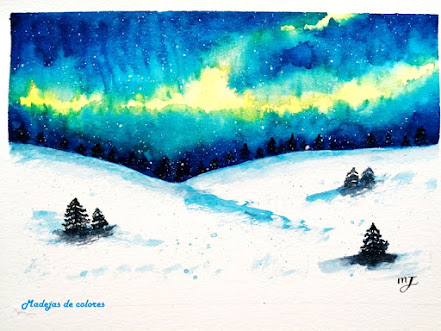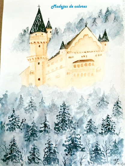 Esta acuarela fue un gran reto para mi, dudé mucho en hacerlo, pues lo veía muy complicado, pero animada por otras compañeras, me lancé, aunque al poco de empezar casi tiro la toalla, pues me encontré con varios inconvenientes. El primero fue el dibujo, nada fácil, además como aconsejan no apretar el lápiz para que luego no se note, al pintar muchas zonas del castillo se perdieron, y con ello la perspectiva. El segundo inconveniente, es que el color predominante es el negro, el cual no venía en la paleta que tengo, por lo que lo tuve que sustituirlo descargando a parte la tinta de rotulador al agua, perdiendo mucho tiempo en ello y perdiendo la intensidad del color.