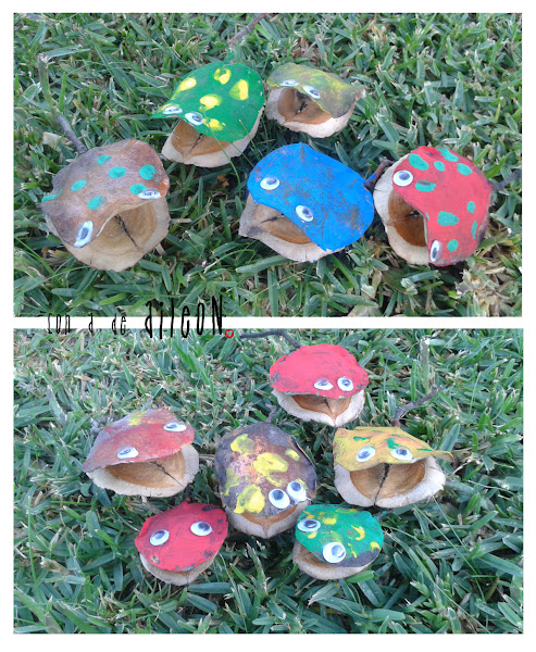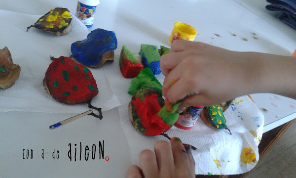Oímos unos gritos de auxilio, provenientes de las ramas secas, así que buscando, buscando, rescatamos los que podimos! Los pobrecitos estaban muy sucios! les dimos un baño y procedimos a pintarlos con témperas y esponjas. Hasta les pusimos ojos para que disfrutaran del sentido de la visión!!