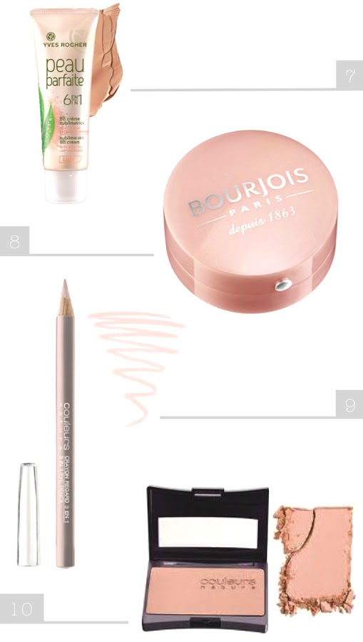 Cuando me arreglo un poco más cambio el maquillaje mineral (1) por la bb cream (7), además de aplicar todos los básicos aplico 2 sombras en mis ojos, una rosa (8) y para dar profundidad uso el tono café del maquillaje pare cejas (2), delineo la parte interior del ojo con el lápiz (9) y también delineo la parte exterior usando de nuevo la sombra café del maquillaje para cejas (2), encima del rubor bronceador (5) aplico un poco de otro rubor (10) y a veces también aplico el tono beige del rubor (5) como iluminador.
