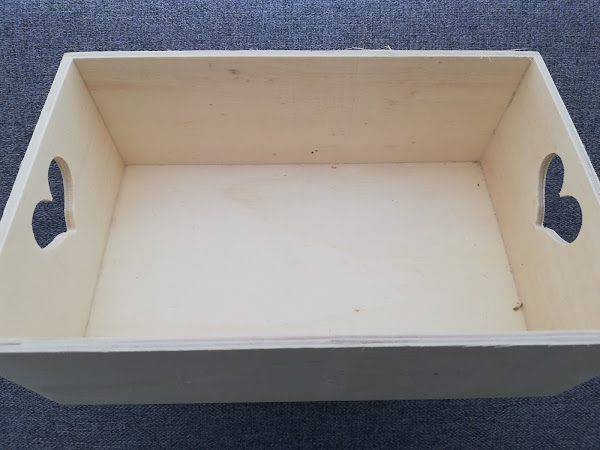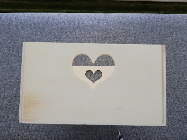 Caja de madera sin tratar con asas en forma de corazón 22 cm x 13,8 cm x 7,8cm, con un precio de 1,75 €.