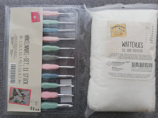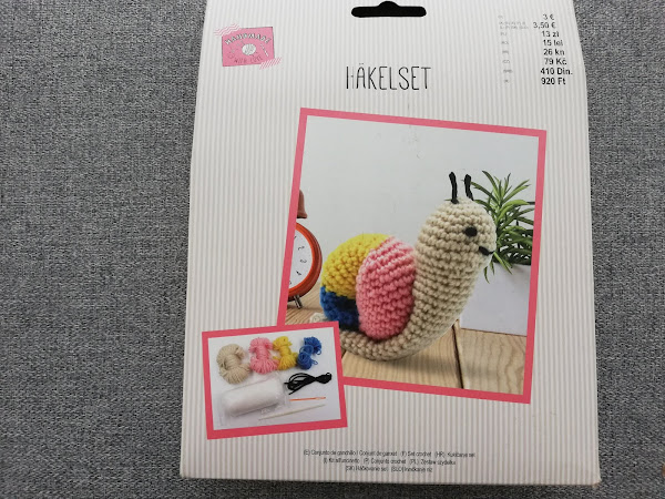 Conjunto de ganchillo para hacer un caracol. Contiene 4 lanas en los colores beige, azul, amarillo, rosa y negro. Aguja de ganchillo, aguja de lana y relleno con un precio de 3,50 €.